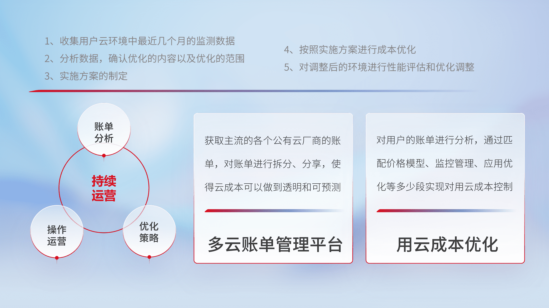 通过多云纳管,,,以统一的资源数据模型把客户的云资源进行抽象和封装,,,,进而实现对多云资源的统一操作,,,保障云资源管理的可靠性、、稳定性与可用性。。。。量身定制化运维内容,,,配置、、、开发运维、、补丁管理、、备份、、、监控、、认证和访问管理、、、、审计和日常巡检等,,保障在用云过程中的可靠度,,稳定度以及高可用率。。。